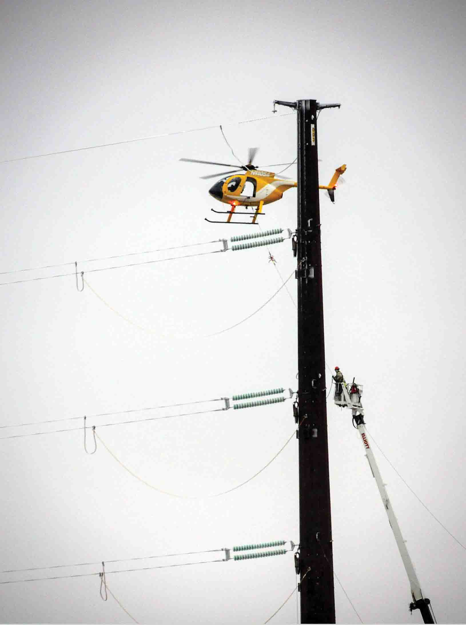 A small helicopter strings one of the lines on the last mile of the 163 mile BSSE transmission line connecting the Big Stone South Substation in South Dakota to the Ellendale Substation. The 345kv line, jointly owned and operated by Otter Tail Power Company and Montana-Dakota Utilities Company, was completed in late 2018, largely for the purpose of connecting wind generated power to Minnesota and points beyond. Photos by Ken Smith editor of the Dickey County Leader, December 3, 2018.