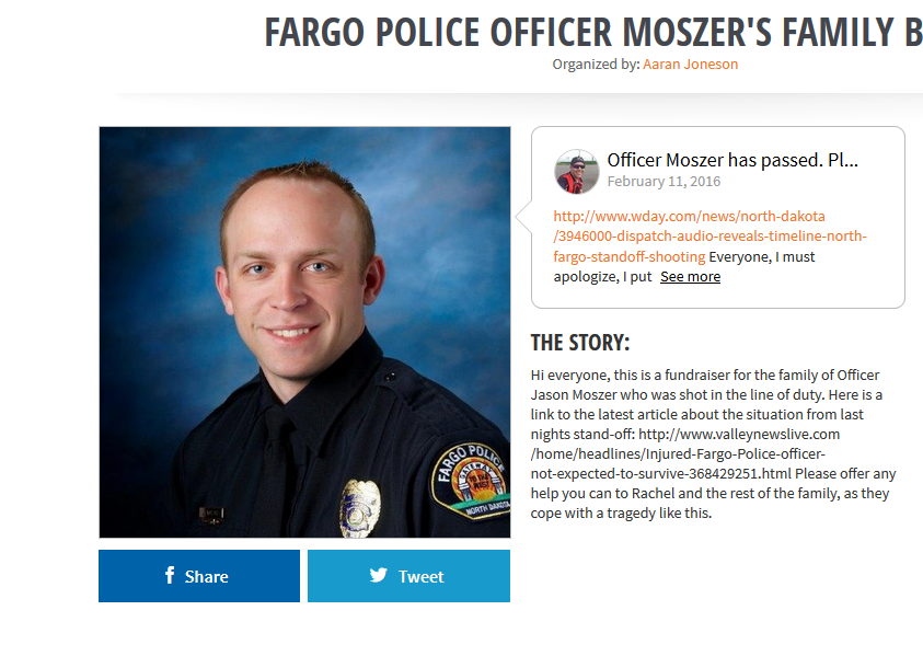 Fargo, ND – At 12:45 PM on February 11, 2016, Fargo Police Officer Jason Moszer officially passed away, as a result of homicidal violence.